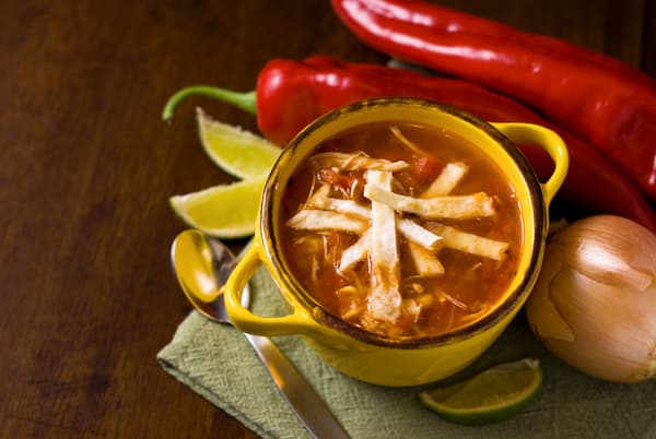 Top with tortilla strips, sour cream, cheese, avocado, and cilantro to taste.