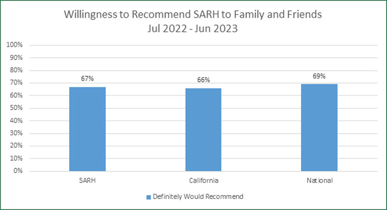 As part of the HCAHPS (Hospital Consumer Assessment of Healthcare Providers and Systems) survey about their experience at San Antonio Regional Hospital (SARH), patients are asked if they would recommend the hospital to their family and friends. This data provides San Antonio with an opportunity to measure our patient’s overall experience during their hospital stay.